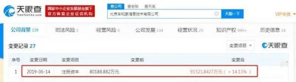 天眼查数据显示,6月14日,理想汽车主体公司北京车和家信息技术有限公司发生工商变更,注册资本由80188.882万元增加至91521.8427万元,增加1亿余元。