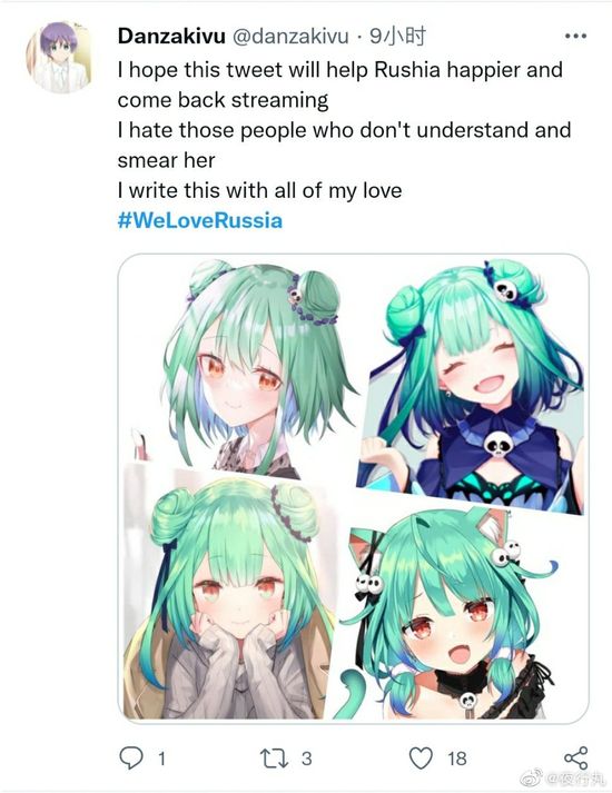 话题主角是一个绿色头发、笑容甜美的动漫少女,她的名字“润羽露西娅”被错译为Russia,是日本头部虚拟主播公司Hololive的当家偶像,正在经历一场声势浩大的恋情绯闻。