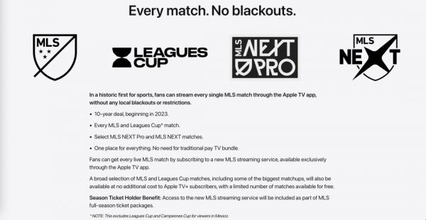 北京时间6月15日凌晨,一条「史无前例」的体育资讯,出现在了苹果官网上:苹果公司和美国职业足球大联盟(MLS)达成10年合作,自2023年开始将在全球范围内直播MLS比赛(Apple and Major League Soccer to present all MLS matches around the world for 10 years, beginning in 2023 )。