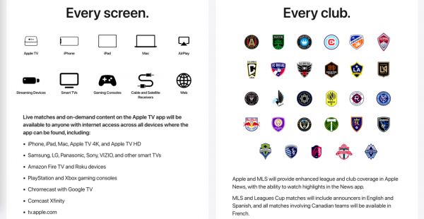 所有在Apple TV直播的MLS比赛,都将配备英语与西班牙语的双音轨解说。而MLS三支加拿大球队(蒙特利尔FC、多伦多FC与温哥华白浪)的所有比赛,Apple TV还将单独为其配备一路法语音轨,以照顾不同地区的受众。