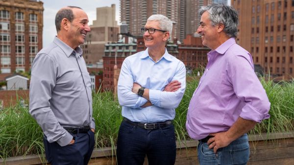 从左到右,MLS高管Don Garber、Apple CEO Tim Cook和Apple服务部高级副总裁 Eddy Cue