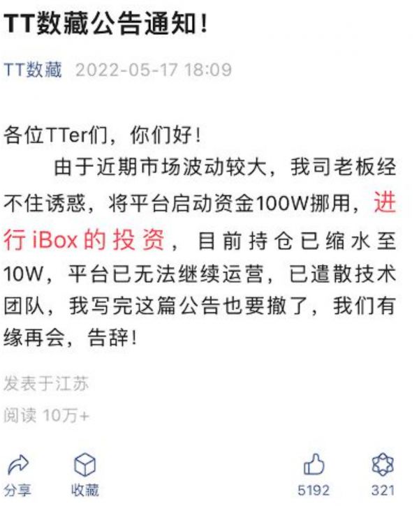 图 | 先前TT数藏爆出CEO挪用资金导致平台无法运营的新闻