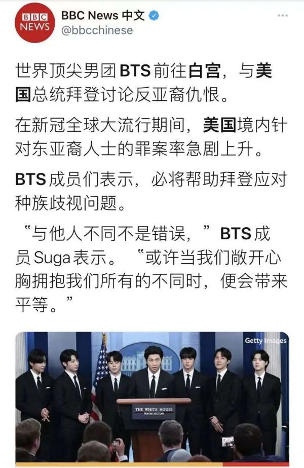 就在不久前的5月31日,防弹少年团受邀在美国白宫新闻办公室,发表反亚裔仇恨演讲。