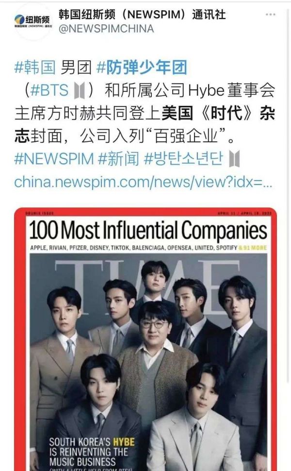 2022年,HYBE更是被美国《时代》杂志评选为2021年“最具影响力的百大企业”之一,而在韩国企业中,一共只有两家上榜,另一家是三星,HYBE还被评为韩国三年来最大的上市公司。