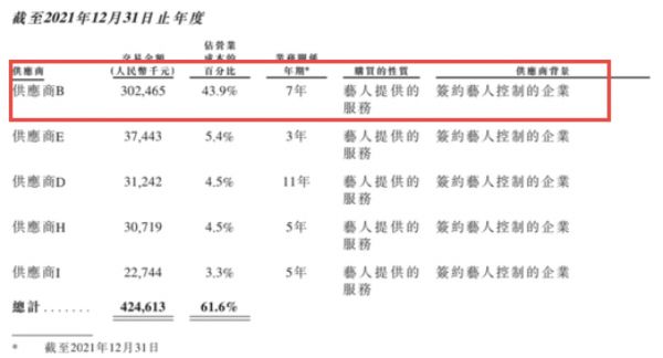 而在其提供的供应商信息中,“供应商B”也被外界猜测为就是王一博。2019年,供应商B的交易金额占总营业成本的百分比只有9.2%,到了2021年,这一数字达到了43.9%,也就是说,乐华娱乐在2021年为王一博采购了超过3亿元服务。