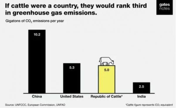 牛的碳排量仅次于中、美,单位:吉吨(1吉吨=10亿吨)图片来源:盖茨基金会