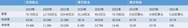 部分牧场2019年-2021年营收、毛利率、净利率情况,36氪制表
