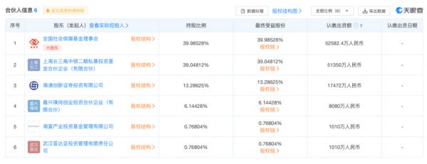 如今,社保基金又一次站在了海富产业基金身后。天眼查显示,海富产业基金新成立的海富半导体基金注册资本为 13.15 亿元,共有六个股东。前四大股东分别为:社保基金出资 5.26 亿元,持股近 40%;上海长三角中银二期私募投资基金出资 5.14 亿元,持股 39%;海通证券全资子公司海通创新证券投资出资 1.75 亿元,持股 13%;嘉兴璞纯创业投资出资 8080 万元,持股 6%。