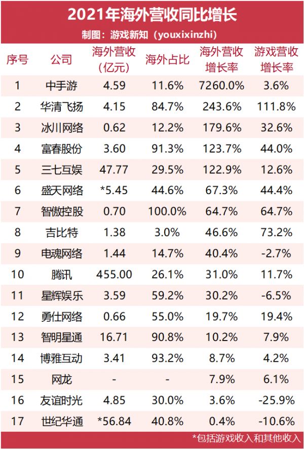 去年海外营收增长超过100%的有5家公司,包括中手游、华清飞扬、冰川网络、富春股份和三七互娱。