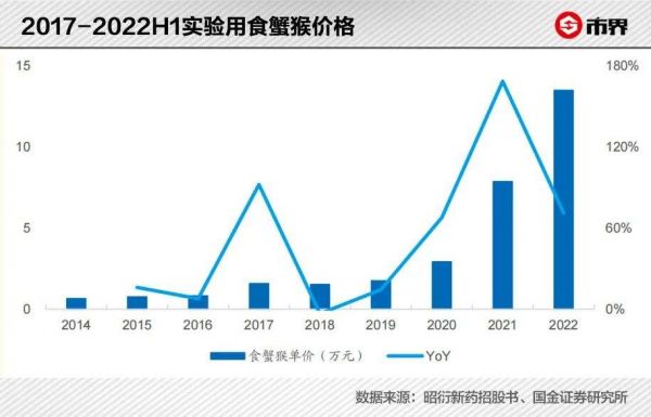 根据国金证券,2014年昭衍新药单只食蟹猴平均采购价格6567元,2019年下半年涨至1.5万元-2万元,2020年7万元,截至目前,价格已超15万元。