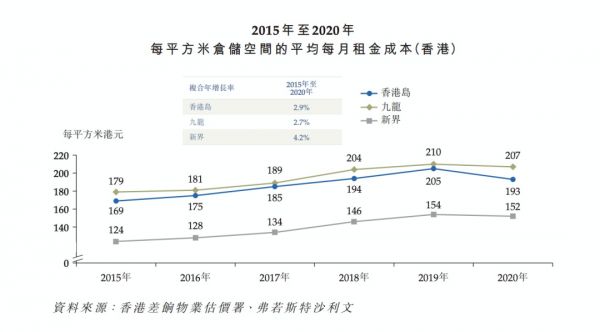 以地租成本为例,过去5年,香港仓储空间每平方米的平均月租成本年复合增长率为2.7%,比如九龙地区,2015年每平方米月租成本为179港元,而2020年为207港元,即每平米的年租成本在2484港元左右。对比京东物流,据2021年财报数据,其仓储网络总面积约2400万平方米,年租金约为95亿元,折合每平米年租金约395元,差距昭然。