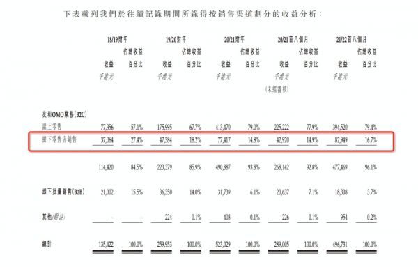 招股书显示,B2C自营占“友和”线上零售额的比重,于18/19财年、19/20财年、20/21财年及21/22前八个月,分别为48.6%、64.0%、76.2%及77.9%。