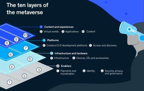 麦肯锡最新研究报告显示,元宇宙由十层组成,可以分解为四个核心构建块:内容和体验、平台、基础设施和硬件,以及促成因素。