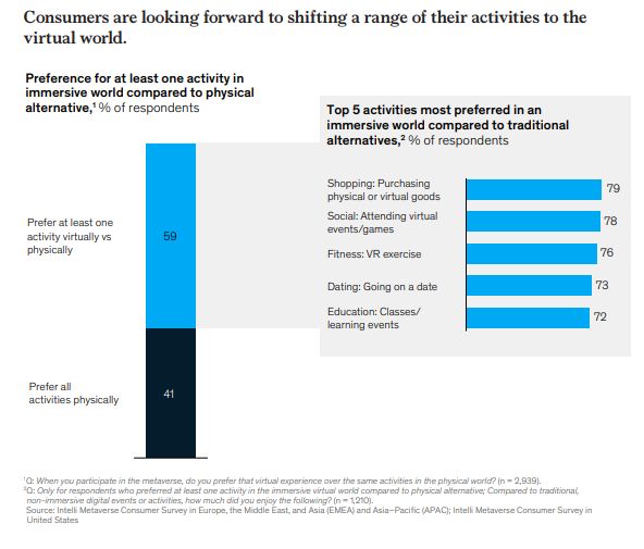 麦肯锡的研究表明,消费者对将生活转变为虚拟世界感到兴奋,几乎十分之六(59%)的消费者更喜欢至少一种虚拟世界体验,而不是其物理替代品。