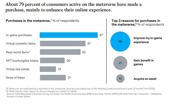 另外79%的受访者表示,他们已经在目前形式的元宇宙中购买过商品,其中47%的人表示曾在游戏中购买过商品,37%的人表示购买过虚拟化妆品,33%的人表示通过虚拟平台购买过真实世界的商品。