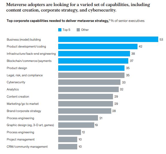 当然,如果要实施Metaverse计划,创新企业也在寻求不同的能力,尤其是构建商业模式、基础设施和后端工程、区块链和电子商务支付、产品设计以及品牌和企业方面的能力。