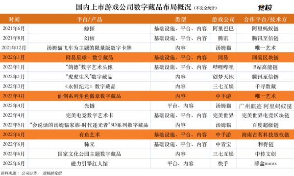 据竞核不完全统计,国内市场已有十余家上市游戏企业,推出了数字艺术品或数字藏品平台。从时间线上来看,包括阿里巴巴、腾讯、汤姆猫、网易、B站、创梦天地、三七互娱、中手游、中青宝、完美世界、快手等。