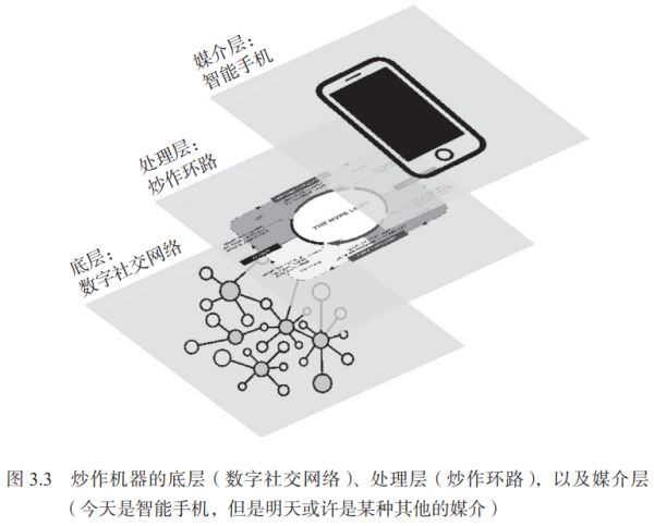 底层指的是数字社交网络,这个网络构建起了我们进行互动的方式;处理层又被称作“炒作环路”,它通过机器智能和人类智能的互动来控制信息在底层的流动;最后是媒介层,也就是智能手机(至少目前是智能手机),它是主要的输入与输出设备,大多数人都是通过智能手机向炒作机器提供或接收有关信息的。任何我们可以用来进行解释的理论或分析,比如,为什么虚假新闻在网上传播的速度会比真相更快,或者为什么炒作机器以其目前的形式会破坏“群体智慧”,都需要我们对这三个组成部分有基本的了解(见图 3.3)。