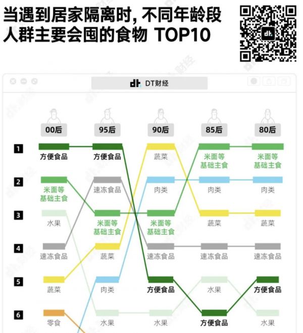 根据DT财经“2022疫情囤货小报告”,不同于其他年龄段人群,00后和95后在居家隔离期间会囤的第一位食物,是方便食品,而不是米面。