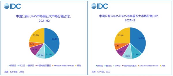 市场份额方面,据国际调研机构IDC发布的报告,阿里云继续在中国公有云IaaS、以及IaaS+PaaS市场雄踞榜首,市场份额分别为37.8%、36.7%,但较2021H1分别下滑了0.8、1.2个百分点。