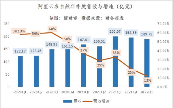 业绩疲软、市场份额被蚕食是最关键的“导火索”。以阿里云为例,2020年(自然年)至今,阿里云季度营收增速整体呈现下滑态势——从2020Q3的60%,一路降至2022Q1的12%。