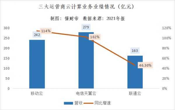 2021年财报数据显示,中国电信天翼云、移动云、联通云营收分别达到279亿元、242亿元、163亿元,分别同比大增102%、114%、46.3%。