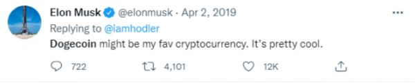 马斯克在币圈里搅动风云,最早是在2019年。这一年的4月2日,马斯克第一次在推特上提到狗狗币,“狗狗币可能是我最喜欢的加密货币了,它太酷了。”