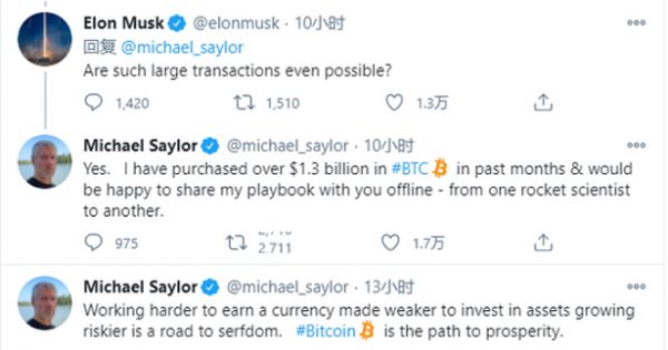 2020年底,马斯克开始对比特币下手。时年12月20日,马斯克在推特上询问数字货币的重要推动者迈克尔·塞勒“将特斯拉公司资产负债表的”大笔交易“转换为比特币的可能性。”