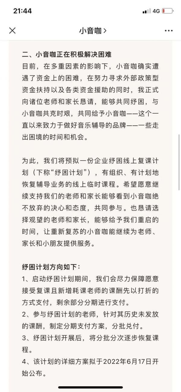 从小音咖的官方微信号来看:第一、公司确实遇到了资金困难,运营困难;第二、小音咖从未放弃,3月以来,创始人李艾和管理团队都在上海从未离开,正在积极寻求外部政策型资金的扶持及各类资金的援助;第三、小音咖推出了纾困计划,希望能缓解部分问题的爆发,暂时解决当下的困境。