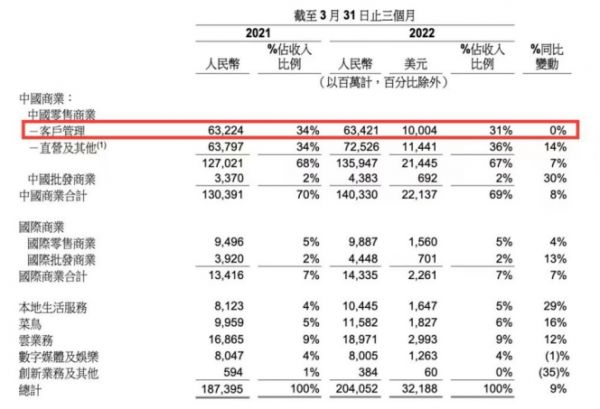 从具体业务上来看,阿里最核心的客户管理业务(主要是淘宝、天猫贡献的广告费和佣金)收入为634.21亿元,同比去年并无增长,在总营收的占比也有所下降,而中国商业零售中的直营及其他业务成为了在总营收占比最大的业务。