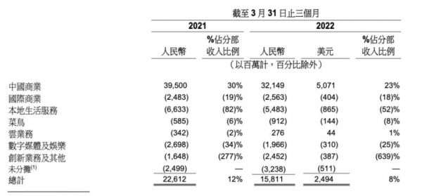 至于云之外的其他业务,不仅在营收中的占比较小,而且都处于亏损状态。其中,阿里的本地生活业务(饿了么、高德、飞猪),受疫情等不确定因素冲击,今年一季度内的订单同比增速仅为9%,而过去整个财年订单同比增长高达25%,单季度亏损金额高达54.83亿元,亏损率高达52%。