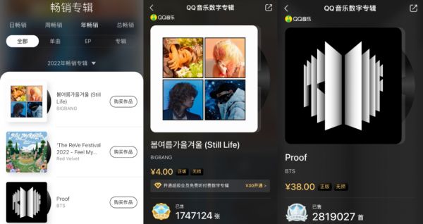 去年限购令后,君不见往日各家流量粉厮斗销量的氪金竞赛,2022年华语歌手们发数专的积极性明显受挫。翻开QQ音乐的2022年畅销专辑榜,你也许会错觉进了哪个K-pop野榜,榜单前列皆是BIGBANG、BTS、SUPER JUNIOR等韩团新专,虽然他们中销量最高的BTS也只卖到281万张的体量,与过往动辄卖几千万张的数专盛世不可同日而语。
