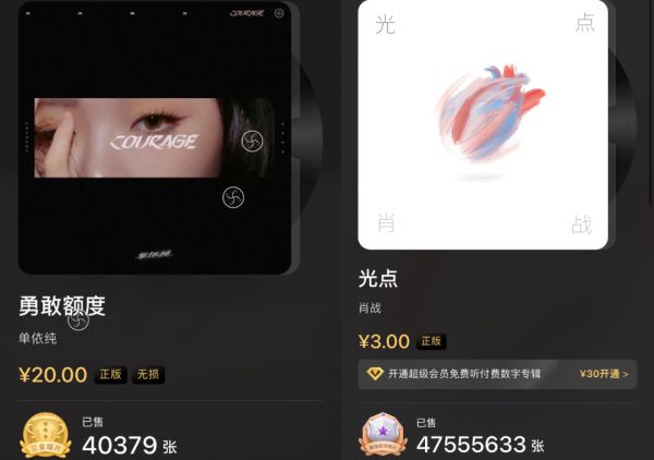 “几千万张”跌到“一两万张”,反映着数专销量集体断崖下跌的行业窘态。单依纯今年1月2号发的《勇敢额度》刚上线时只卖了12035张,截至发稿销量数停留在40369,无论怎么看都是不及格成绩,昭示着非偶像歌手变现的困境。去年行业普遍认为限购令有望助市场告别流量裹挟,但很显然,非流量的实力歌手并没有等来春天。