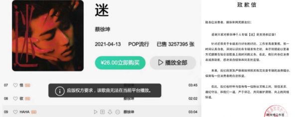 肖战《光点》卖47555617万,一个耽改剧演员在卖歌界独孤求败,这种行业怪事在当年是颠覆路人三观的。直到去年8月,蔡徐坤《迷》“赊歌风波”上了社会版新闻,专业律师称提前预售专辑却长达4个月“赊”下6首歌不发的行为涉嫌违法,看到“违法专辑”还堂而皇之割了韭菜们325万张,网信办坐不住了,清朗行动最先抓《迷》为典型对象开刀,音乐平台火速跟进限购令,自此,饭圈再不能把数专用作证明自家哥哥多棒的“吹嘘筹码”。
