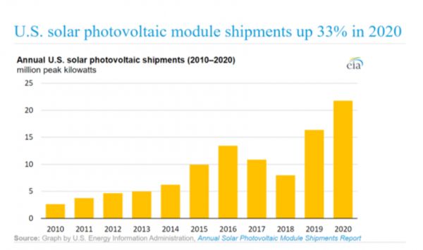 根据美国能源信息署的数据,美国的太阳能光伏组件的出货量在2020年达到了21.80吉瓦,比2019年增加5.40吉瓦。