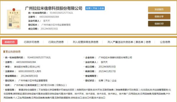 根据国家企业信用信息公示系统显示,拉拉米成立于2012年8月30日,公司法定代表人为李天天。另据企查查信息,李天天为拉拉米的实际控制人和最终受益人。