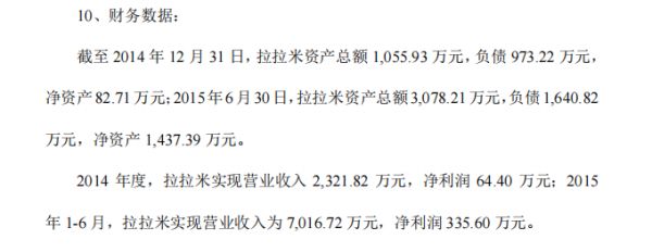 从潮宏基2015年发布的投资公告来看,截至2015年6月30日,拉拉米资产总额3078.21万元,负债1640.82万元,净资产为1437.39万元。