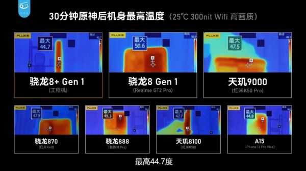 温度方面更是夸张,玩《原神》30分钟后,骁龙8+ Gen 1机身温度仅44.7°,持平搭载天玑8100的Redmi K50,比iPhone 13 Pro Max温度都低。需要注意的是,骁龙8+ Gen 1是工程机版本,没有强大的散热,如果是量产旗舰机的散热,数据可能会更强。很有可能,新一代冰龙要来了。
