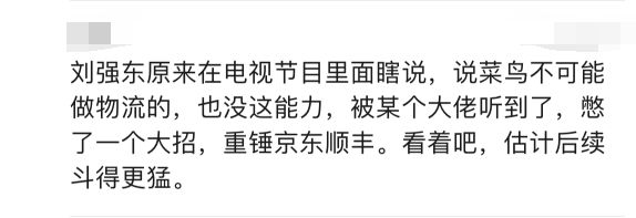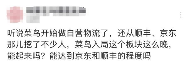 有人发出质疑菜鸟入局这个板块这么晚,能达到京东、顺丰的程度吗?