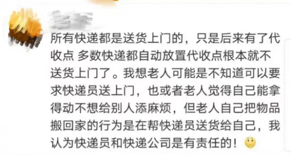 更让人难以接受的是,一些上了年纪的老人也经常走很长的路去取一件或许很重的快递,比如一袋子猫砂,几十斤重,如果楼层又比较高,老人是搬不上去的。