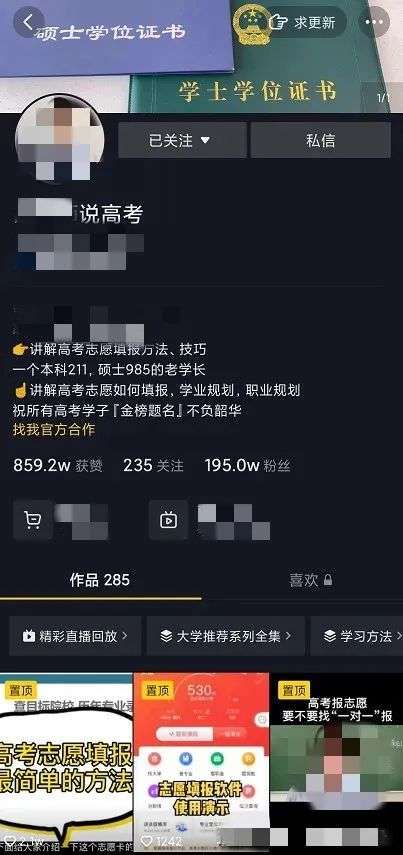 在北京做二手手机生意的王女士,在今年春节后就关注了某短视频账号,“我们没有学历,没有经历过高考,现在只能先学习,听老师讲得挺好,持续关注了3个多月,花了2000多报的‘志愿填报服务’”。