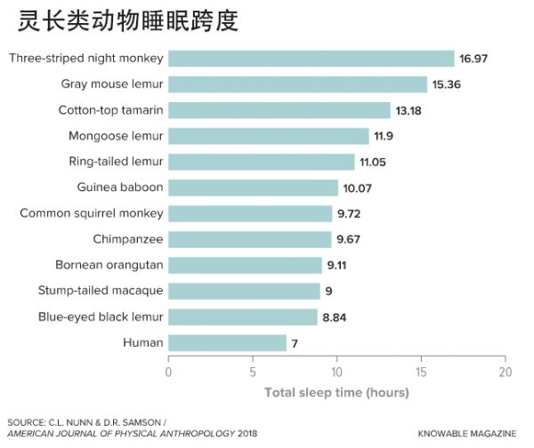 加拿大多伦多大学密西沙加分校(University of Toronto Mississauga)的演化人类学家大卫·萨姆森(David Samson)称,研究表明,非工业社会(最接近人类演化所处的环境)的人群每晚平均睡眠时间不足7小时。想想我们的动物近亲,这个数字真令人惊讶。人类的睡眠比任何一种已被科学家研究过的猿、猴或狐猴都要少。黑猩猩每24小时睡9.5小时左右,棉顶狨睡13个小时左右,夜猴严格来说是夜行的,但实际上它们几乎从来都不清醒,它们一天睡17个小时。