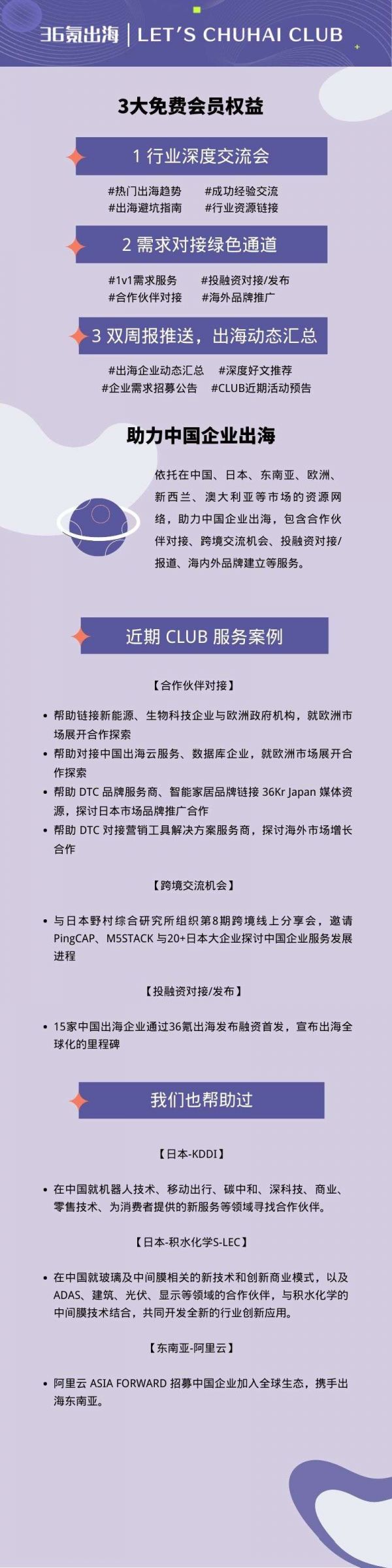 36氪出海|CLUB 持续招募企业决策者!近期,CLUB帮助会员链接出海日本/欧洲合作伙伴与行业资源