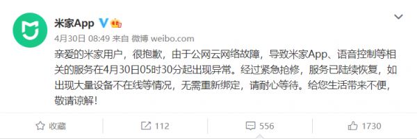 在今年4月30日,米家App便曾出现过一次因网络故障致使用户无法访问。当时,米家App便曾在官方微博发文回应,称“由于公网云网络故障,导致米家App、语音控制等相关的服务在4月30日05时30分起出现异常。经过紧急抢修,服务已陆续恢复。”并对此道歉请求用户原谅。