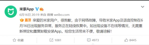 而对于此次故障,米家App再次作出回应称,“由于网络故障,导致米家App及语音控制在6月16日出现服务异常,服务正在陆续恢复中。如出现设备不在线等情况,无须重新绑定和重复卸载安装App。”