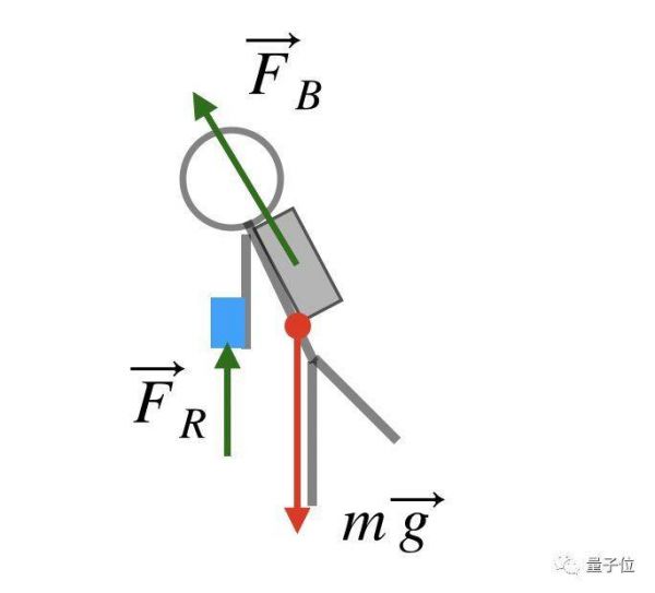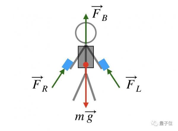 因为这样一来,就会受到4个力的作用:有向下的重力(mg),来自背包喷射产生的向上的推力(FB),以及来自两个手臂喷射装置向上的倾斜的力(FR和FL),各个力的方向与构造大致如下图所示:
