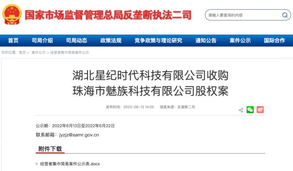 6月13日,国家市场监督管理总局反垄断执法二司发布《湖北星纪时代科技有限公司收购珠海市魅族科技有限公司股权案》,星纪时代已与魅族科技以及涉及交易的股东签署协议拟收购魅族79.09%股权。