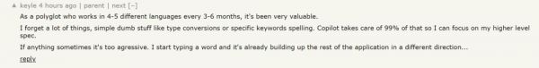 这位开发者表示:“我容易忘记很多事情,甚至是一些很简单的蠢事,如类型转换或特定的关键词拼写。而 Copilot 可以解决 99% 的问题,这样我就可以专注于我的高级规格。”