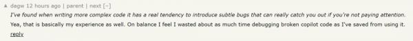 然而也有个别网友则表示:自己浪费在调试 Copilot 写的错误代码上所花的时间和使用它所节省的时间一样多。