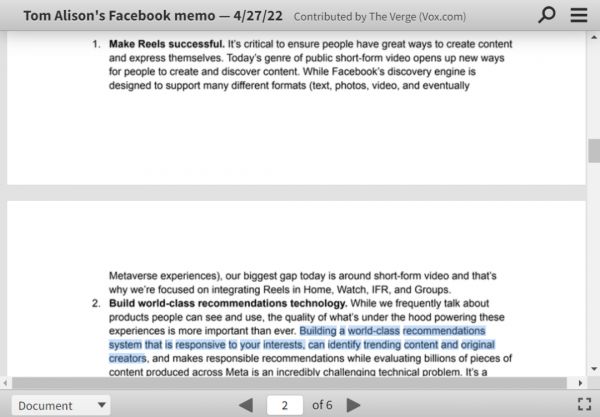 早在 2022 年年初,扎克伯格在一次对话中就表示,认为有必要重新构建 Facebook 的 Feed 流。最近 the Verge 拿到的一份 Facebook 产品负责人 Alison 的备忘录则显示,这个设想已经被推上了日程。在这份备忘录里,Alison 提到 Facebook 的新目标是搭建一个“发现引擎”,这也是扎克伯格在最近一次电话会议中提到的 Meta 的最高优先性事务。基于这个“发现引擎”,Facebook 用户在 App 内信息流中将会被推荐大量的来自未关注账户的内容,相应地,Facebook 用户的信息流中来自熟人的帖子会减少。(在此之前,Facebook 的信息流算法侧重于向用户推荐来自熟人的内容,这一点会在下文中详细介绍)